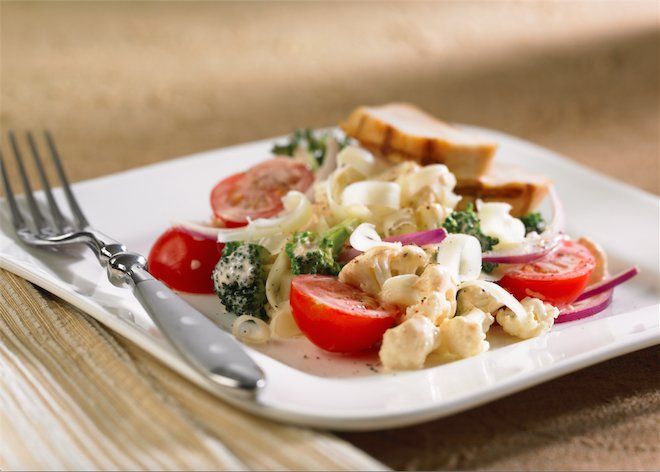 Tips: If you prefer gently cooked vegetables instead of raw, blanch the cauliflower and broccoli in a large pot of boiling, salted water for about 2 minutes. Drain well and let cool before adding to salad. Or, use frozen vegetables. Just thaw, drain well and pat dry.