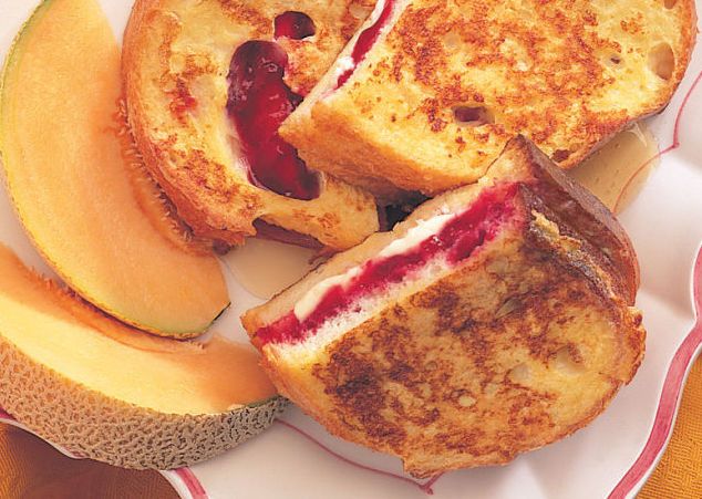- Tartiner également le fromage sur 4 tranches de pain. Étaler la confiture sur le fromage. Couvrir des autres tranches de pain.