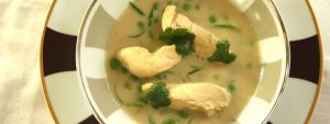 - Dans des assiettes creuses, déposer les légumes, puis ajouter du bouillon au lait de coco, quelques morceaux de poulet et de la coriandre hachée.