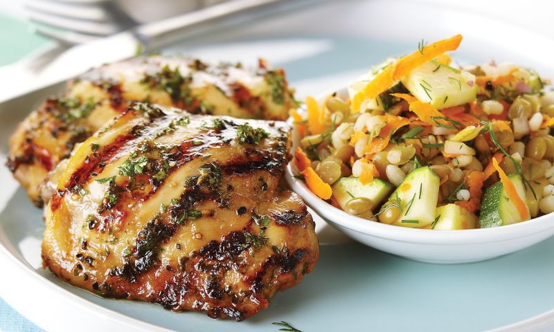 - Préchauffer le barbecue à feu moyen. Griller les hauts de cuisses de poulet, environ 10 minutes de chaque côté ou jusqu'à ce que la température interne atteigne 74 °C (165 °F). Pour servir, placer le poulet au centre d'un plat de service ou dans des assiettes individuelles. Répandre la salade à l'orge et aux lentilles autour du poulet et garnir des brins d'aneth, si désiré.