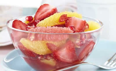 - Verser les fraises champêtre tranchées Europe's Best dans un plat de service. Laisser décongeler en préparant les pamplemousses et les oranges. Ajouter les quartiers de pamplemousses et d'oranges, les pépins de grenades et les petits fruits. Remuer délicatement pour mélanger.