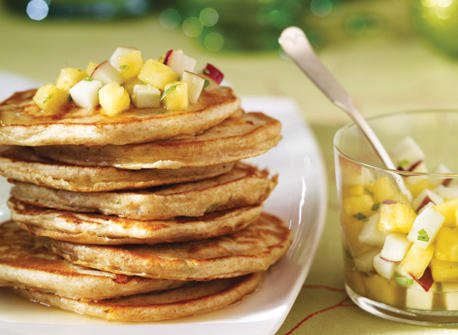 - La pâte devrait être complètement cuite au centre. Répéter l'opération avec le reste de la pâte. Pour aller plus vite, utiliser plus d'une poêle à la fois.Servir les crêpes chaudes et garnies de la salsa aux pommes et à l'ananas.