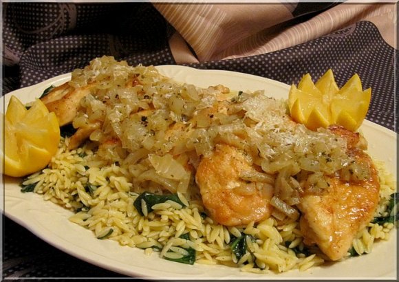 - On laisse rédauire la sauce .Il ne restera qu'à déposer le poulet sur l'orzo aux épinards, de napper le tout de la sauce citronnée et de saupoudrer généreusement de Parmigiano.