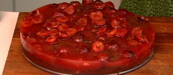 - Une fois le tout refroidi, verser le mélange de cerises sur le gâteau, et laisser prendre la gelée au réfrigérateur quelques temps.