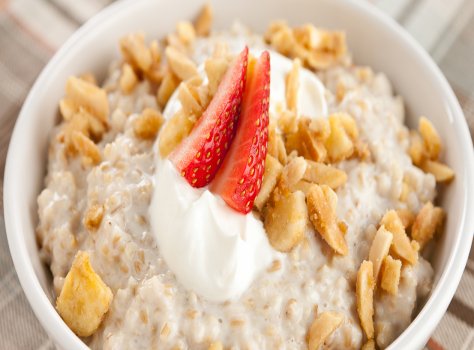 - Verser le gruau dans 4 bols.Garnir de yogourt, de garniture bananes et noix et de muscade fraîchement râpée.