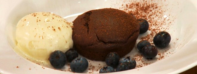 - Prélever ensuite des morceaux de ganache et les mettre au centre des muffins. Recouvrir de la préparation et cuire au four 35 min. Servir avec des petits fruits et de la glace au soya.