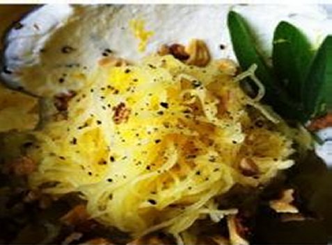 - Prélever la chair de la courge en grattant avec une fourchette : cette dernière prendra la forme de longs filaments, d'où le nom de « courge spaghetti ».Au service, étendre le beurre de sauge au yogourt Oikos dans le fond du plat, placez la courge spaghetti au centre, saupoudrer de noix de Grenoble concassées, puis de zeste de citron. Saler au goût, donner un dernier coup de moulin à poivre, puis déguster.