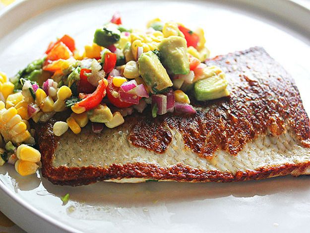 Poêlé de poisson blanc avec une relish de maïs, avocat, et Basilic.
