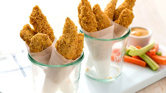 Cliquez pour agrandir Doigts de poulet en croûte de tortilla & crudités