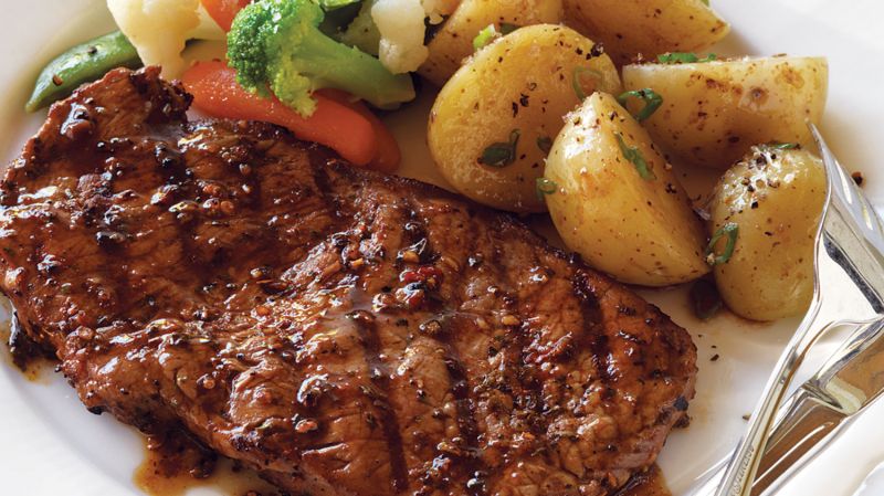 - Entre-temps, enduire la grille du barbecue d'une mince couche d'huile et l'amener à température mi-élevée (ou préchauffer un gril électrique). Retirer les steaks de la marinade. Faire cuire les steaks jusqu'à tendreté voulue, de 6 à 8 minutes par côté pour une cuisson moyenne, selon l'épaisseur. Déposer les steaks cuits sur une planche à couper, les couvrir légèrement et les laisser reposer 5 à 10 minutes. Réserver 2 steaks cuits et 500 ml (2 tasses) de pommes de terre pour la recette de Steak balsamique et salade d'épinards du lendemain. Étendre les 30 ml (2 c. à soupe) de vinaigrette qui restent sur les steaks en guise de sauce. Servir avec le reste des pommes de terre et les légumes.