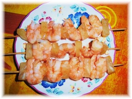 - Sur des piques à brochette en bois trempés pendant 10 minutes dans l'eau (évite qu'ils brûlent pendant la cuisson), piquer un bout d'ananas, une crevette, ainsi de suite...